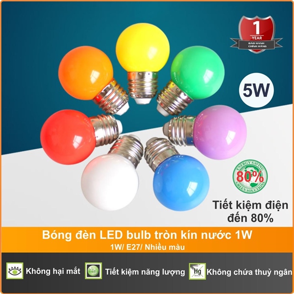Bóng LED bulb tròn 1W kín nước (Xanh Dương)Công suất: 1WKiểu đui: E27Kích thước (ØxH)mm: 45x65Điện áp: 220V/50HzÁnh sáng: Nhiều màu (trắng, vàng, vàng ấm, cam, đỏ, hồng, xanh lá, xanh dương)Quang thông: 550lmHệ số công suất: 0,9Chỉ số hoàn màu (CRI): >85Cấp độ bảo vệ (IP): 44Bảo hành: 1 nămQuy cách đóng gói: 84 bóng/thùng