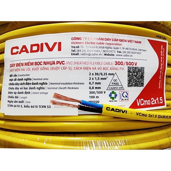 Mô tả sản phẩm – Dây Điện Dẹp Cadivi VCmo 2 x 2.5 mm²Thương hiệu: Cadivi – thương hiệu dây cáp điện nổi tiếng, uy tín tại Việt Nam.