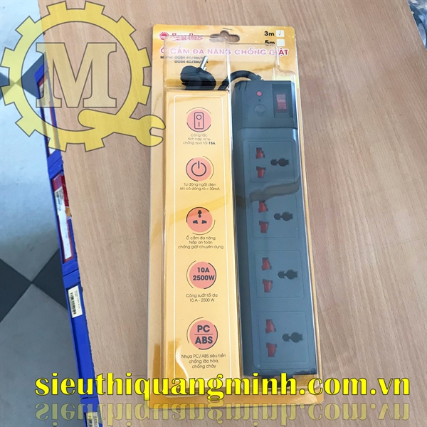 Đặc tính spChiều dài dây: 3mKích thước (DxRxC): (270x60x35) mmKhối lượng: 0.4 kg Thông số điện:Điện áp hoạt động tối đa: 250V Dòng điện ổ cắm tối đa: 10ACông suất ổ cắm tối đa: 2500WDải nhiệt độ hoạt động: (-10-45)°C Ứng dụng:Phòng ngừa giật điện: Ổ cắm sẽ ngắt điện hoàn toàn trong tích tắc (thời gian tính bằng mili giây (ms) ) khi phát hiện dòng rò > 30mA, đảm bảo an toàn cho người sử dụng, đặc biệt là trẻ nhỏ và người già.Bảo vệ các thiết bị điện: Trong quá trình sử dụng, một số thiết bị có thể bị rò điện. Khi phát hiện dòng rò, ổ cắm chống giật sẽ tự động ngắt nguồn vừa đảm bảo an toàn điện vừa giúp phát hiện hư hỏng các thiết bị để sửa chữa.Ứng dụng đa dạng và linh hoạt: Ổ cắm kéo dài đúng như tên gọi của nó là thiết bị được nối thêm dây để di chuyển tới nhiều vị trí khác nhau. Do vậy, sử dụng ổ cắm kéo dài rất thuận tiện khi ổ cắm đơn không có khả năng đáp ứng truyền tải cùng lúc đến các thiết bị khác nhau (Hộ gia đình) hay chỉ ổ cắm kéo dài mới đủ cắm bộ máy tính, quạt, đèn bàn (Văn phòng công sở) và thuận tiện khi trường học có các buổi họp đông người hay bệnh viện có đông bệnh nhân (Trường học & Bệnh viện).