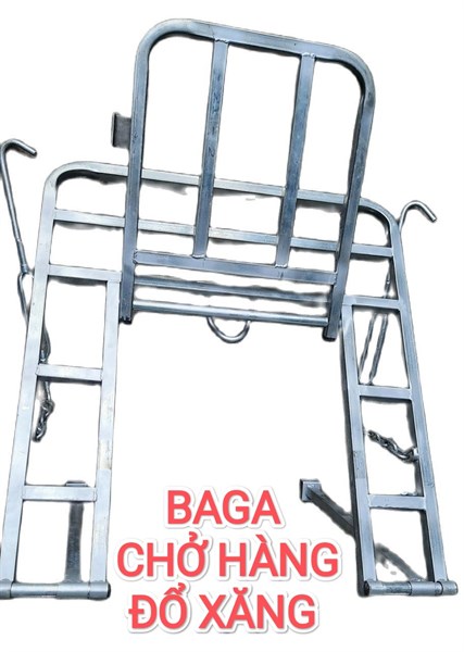 Chỉ tiêuVí dụ phổ biếnKích thước mặt baga50 × 56 cmKích thước baga lớn hơn60 × 70 cmTải trọng tối đa150 – 200 kgChất liệuThép mạ kẽm, thép vuông 20 × 20 × 1,2 mmTrọng lượng bagaVí dụ 5 kg (với kích thước 50 × 56)Cấu tạo & tính năngCó cánh mở, cửa/nắp mở để đổ xăng, gấp gọn khi không dùng, lắp dễ dàng < 3 phút, có thanh chặn chống trượtƯu điểmTiện lợi khi đổ xăng: không cần gỡ baga — chỉ mở phần nắp mở.
