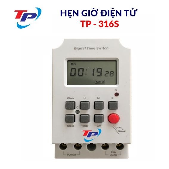 HẸN GIỜ ĐIỆN TỬ TP-316S1-Giới thiệu: Timer TP-316S là thiết bị hẹn giờ kỹ thuật số ,tự động Bật/Tắt thiết bị điện theo thời gian đã cài đặt.Với chu kỳ tối đa 28 lần Bật/Tắt được lặp lại hàng tuần hay từng ngày theo nhu cầu người dùng, thời gian cài đặt tối thiểu là 1 giây. Với thiết kế dạng gắn ray phù hợp cho dân dụng và công nghiệp .Thiêt bị được tích hợp pin dự phòng mà không cần chỉnh lại giờ khi mất điện2-Ứng dụng:Giải pháp cho các ứng dụng tự động reo chuông trường học , nhà máy, hẹn giờ tưới hoa kiểng nhà vườn, các hộ trồng hoa, cây cảnh,… vì có thể cài đặt hệ thống hẹn giờ cho các thiết bị tưới tiêu, chiếu sáng, nhà yến..Giải pháp cho các hộ chăn nuôi thủy hải sản, các hộ chăn nuôi gia xúc gia cầm,… vì có thể lắp thiết bị hẹn giờ cho các máy bơm nước hoặc hệ thống chiếu sáng theo chu kỳ nhất định