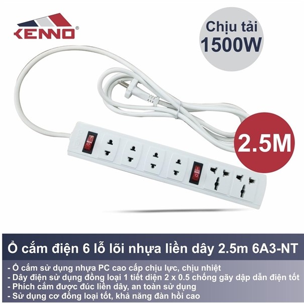 Ổ cắm 6 lỗ chịu tải 1500W dài 2,5m/4,5m 6A3-ND/6A5-ND Chịu tải tối đa 1500W- Dây dài 2,5m/4,5m- Lõi nhựa chịu nhiệt, chống đánh lửa- Vỏ nhựa PC cao cấp, chịu lực chịu nhiệt- Lò xo tăng lực kẹp, tăng tiếp xúc- 2 công tắc riêng biệt- Dòng định mức : 10A-250V- Chỉ 400gr/sản phẩm- Bảo hành: 3 tháng