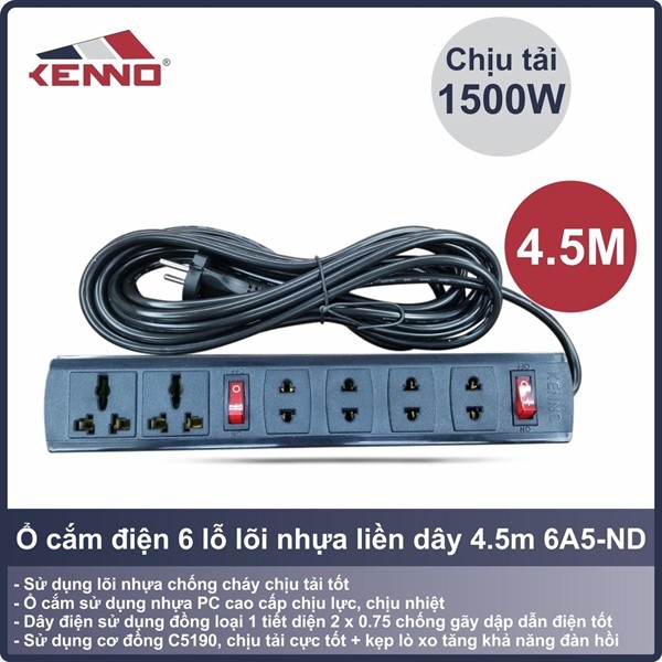 Ổ cắm 6 lỗ chịu tải 1500W dài 2,5m/4,5m 6A3-ND/6A5-ND Chịu tải tối đa 1500W- Dây dài 2,5m/4,5m- Lõi nhựa chịu nhiệt, chống đánh lửa- Vỏ nhựa PC cao cấp, chịu lực chịu nhiệt- Lò xo tăng lực kẹp, tăng tiếp xúc- 2 công tắc riêng biệt- Dòng định mức : 10A-250V- Chỉ 400gr/sản phẩm- Bảo hành: 3 tháng