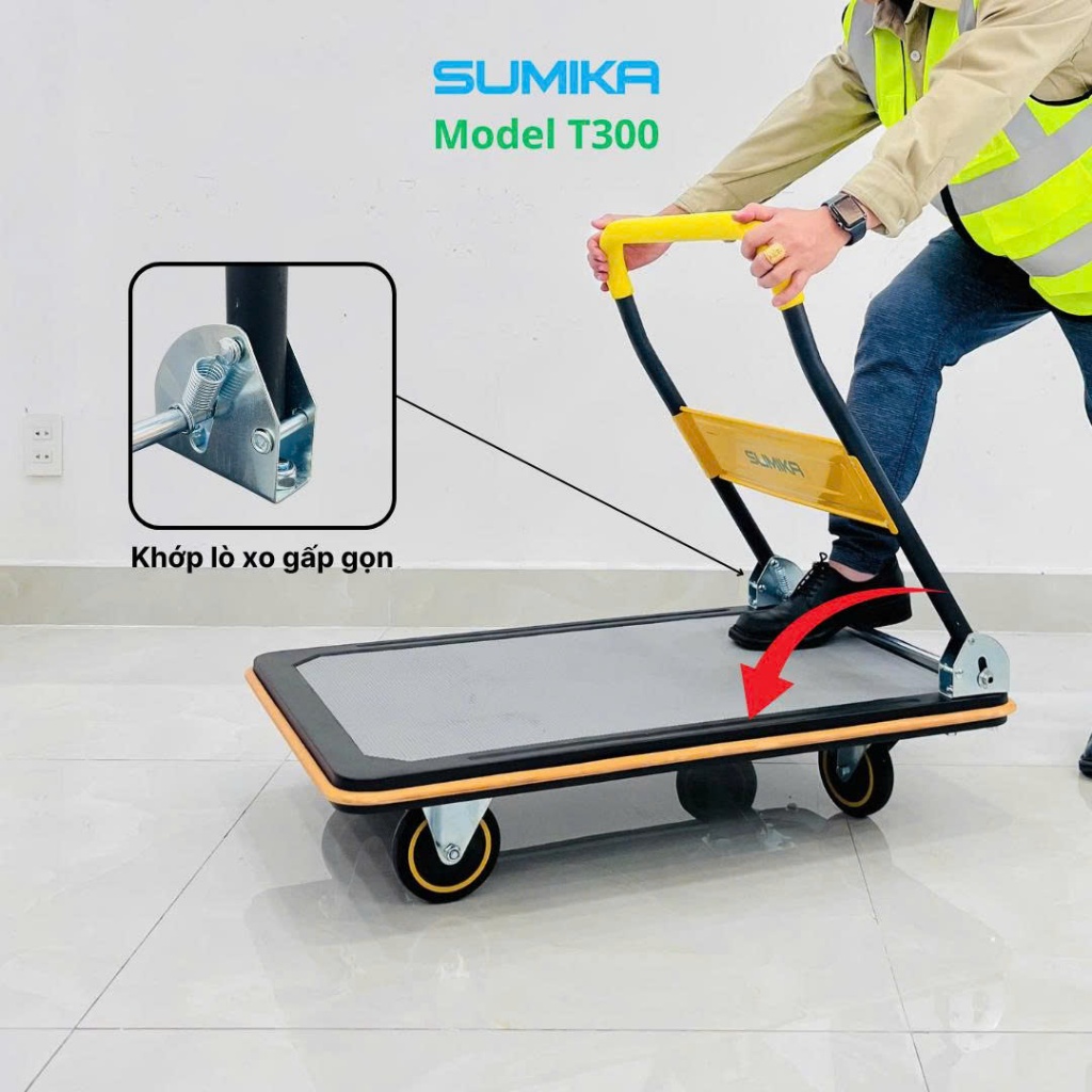 Xe đẩy Sumika T300 là loại xe đẩy hàng 4 bánh, thiết kế sàn phẳng bằng thép bọc nhựa cao cấp, tay đẩy có thể gập gọn khi không sử dụng. Xe phù hợp dùng trong kho hàng, cửa hàng, siêu thị, văn phòng, nhà xưởng, giúp vận chuyển hàng hóa nặng nhẹ dễ dàng, tiết kiệm sức lao động.