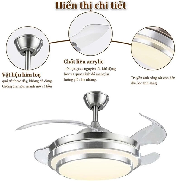 Chất liệu: vỏ kim loại, vỏ đèn acrylic, cánh quạt ABS
