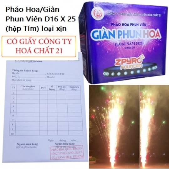 1. Công dụng:Pháo hoa – Giàn phun viên là một loại pháo hoa không gây tiếng nổ. Khi phát hỏa, một chùm viên cháy có nhiều màu sắc (đỏ, xanh lục, xanh lơ, vàng,…) được phun lên không trung. Pháo hoa – Giàn phun viên được sử dụng trong các trường hợp sau: Lễ, hội, tết, sinh nhật, cưới hỏi, liên hoan, hội nghị, sự kiện,…